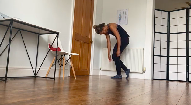 By rounding the back and tucking the chin, your back and your neck relax. Make sure your weight is now onto the mid-foot while your knee is slightly bent. Completely let go of your head and your back, while keeping your knee slightly bent, and reach for the floor. You can add stability by making sure your mid-foot is pushing into the floor as you go down. Once you’ve reached down, come back up again pushing your mid foot and making sure your knee stays bent.